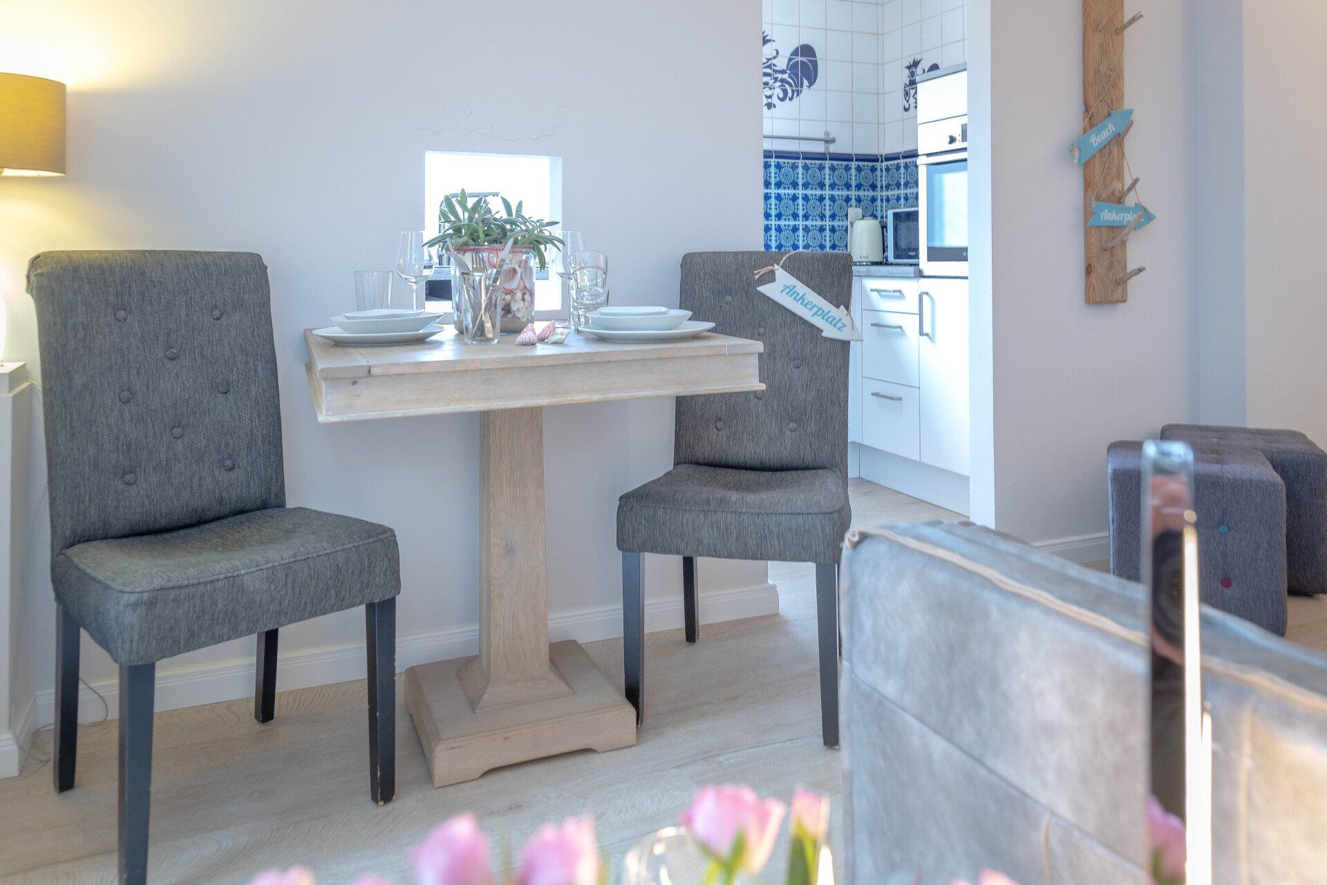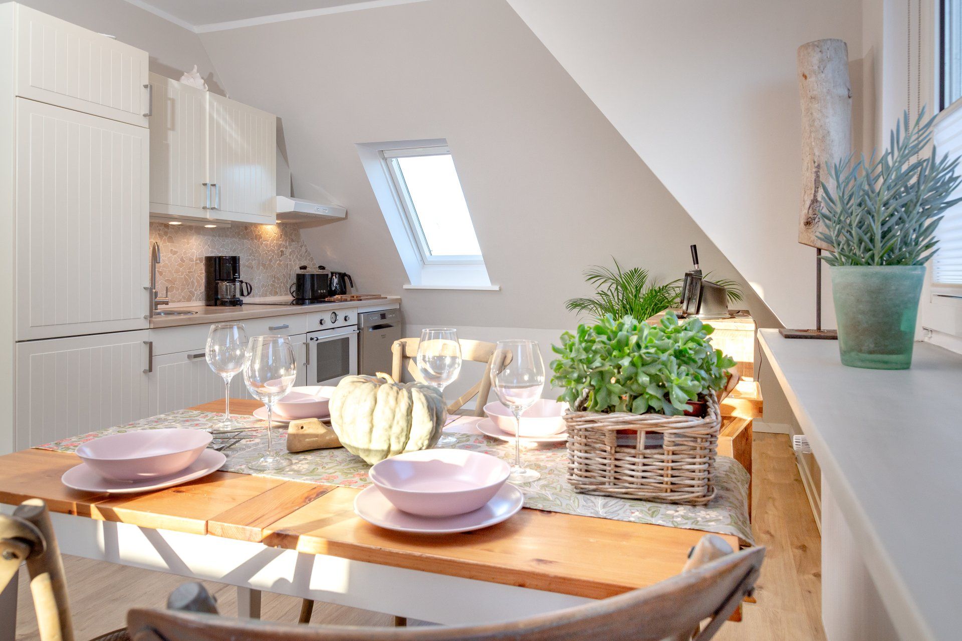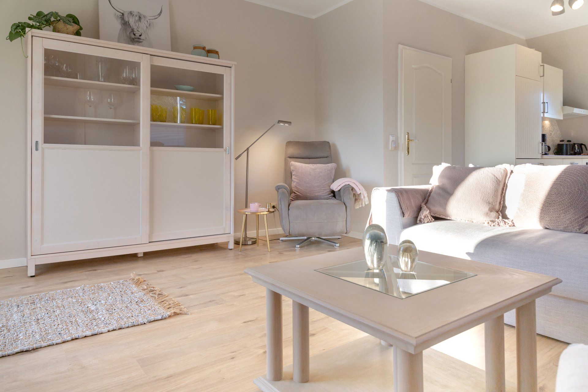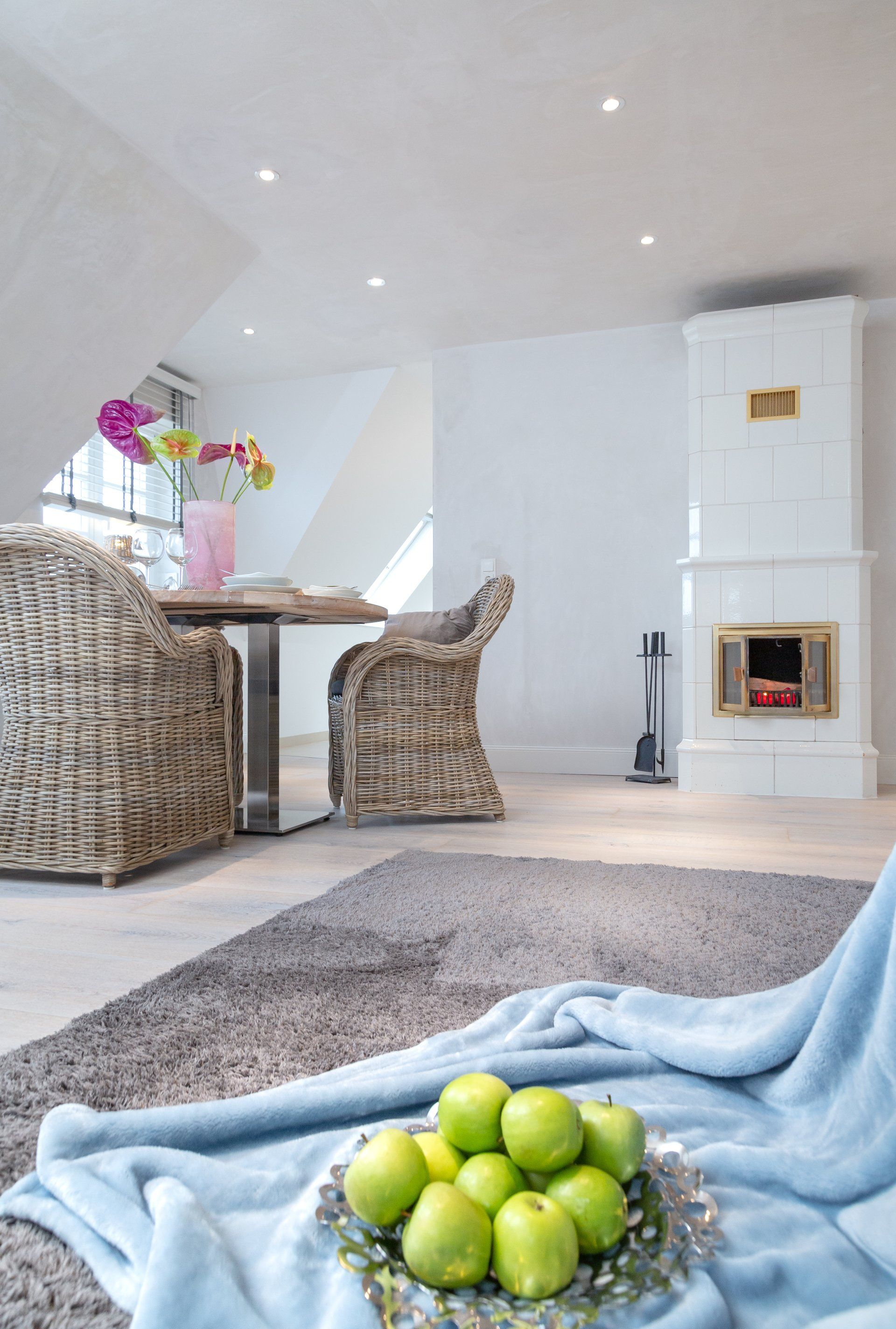 Das Möwennest ist hochwertig ausgestattet. Echtholzparkett auf den Böden und Mineralputz an Wänden und Decken verleihen der Wohnung ein gesundes Wohnklima. Ein Kachelofen sorgt in der kühleren Jahreszeit für eine kuschelige Atmosphäre.