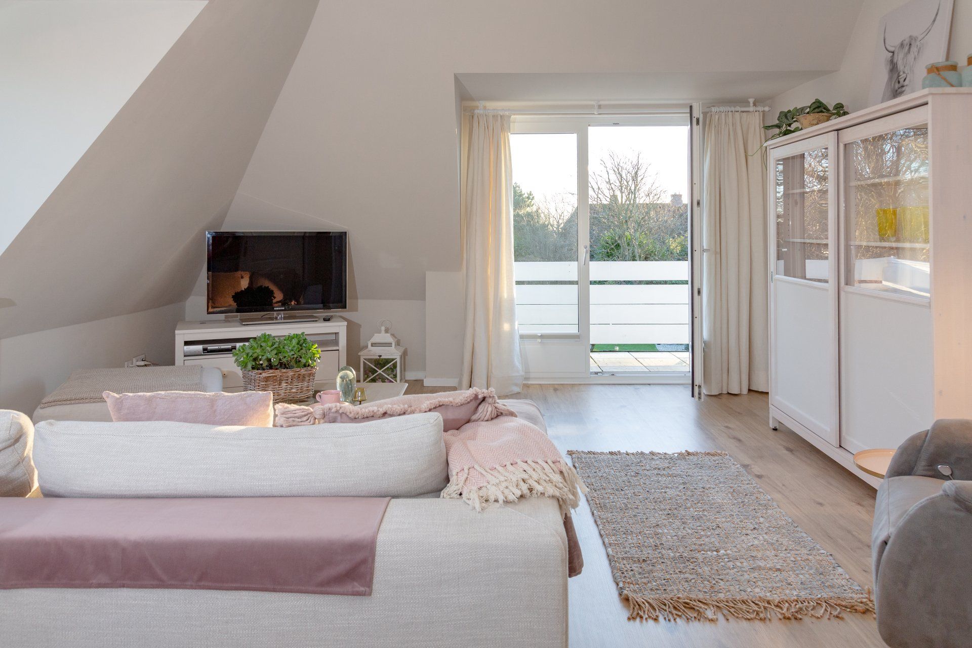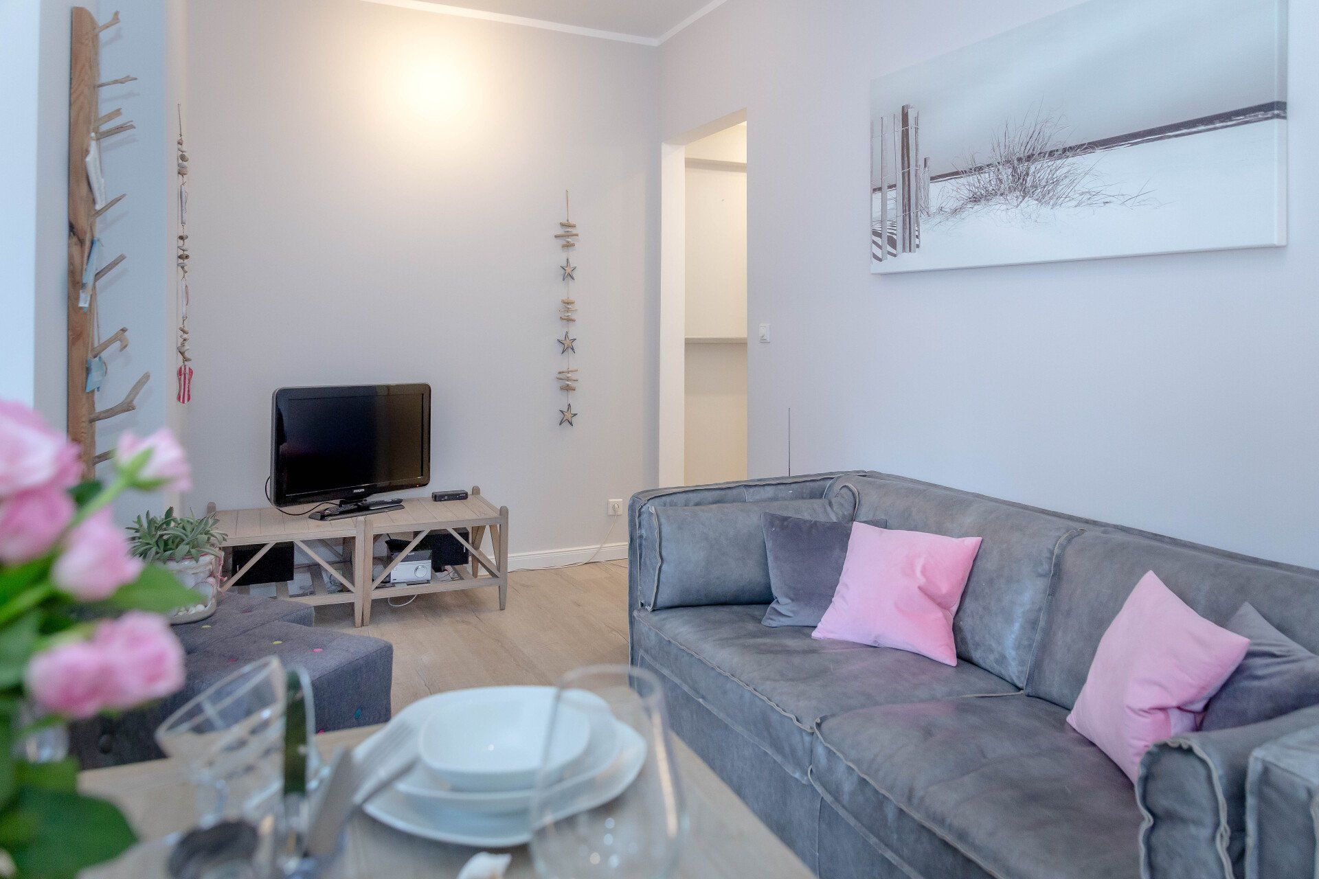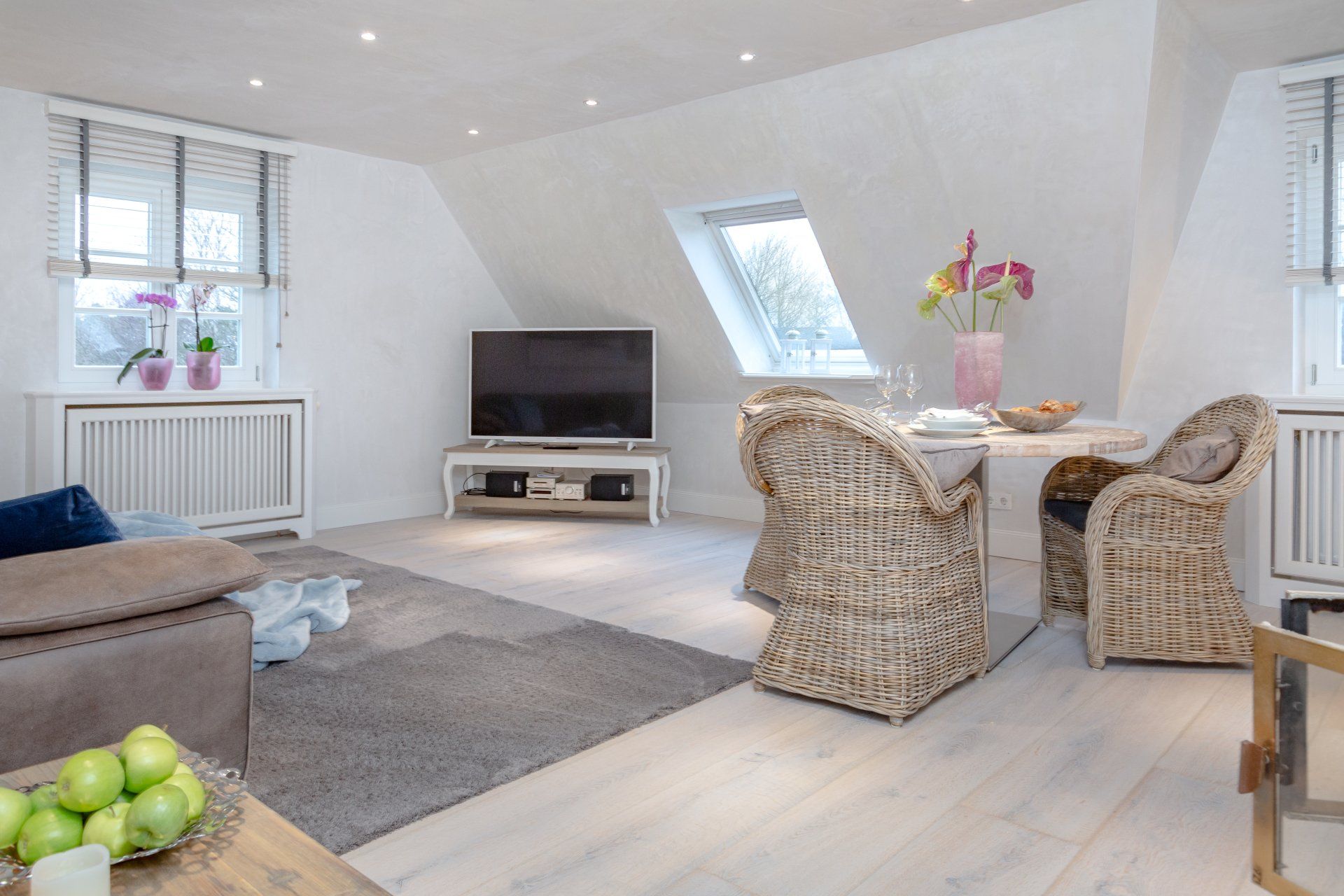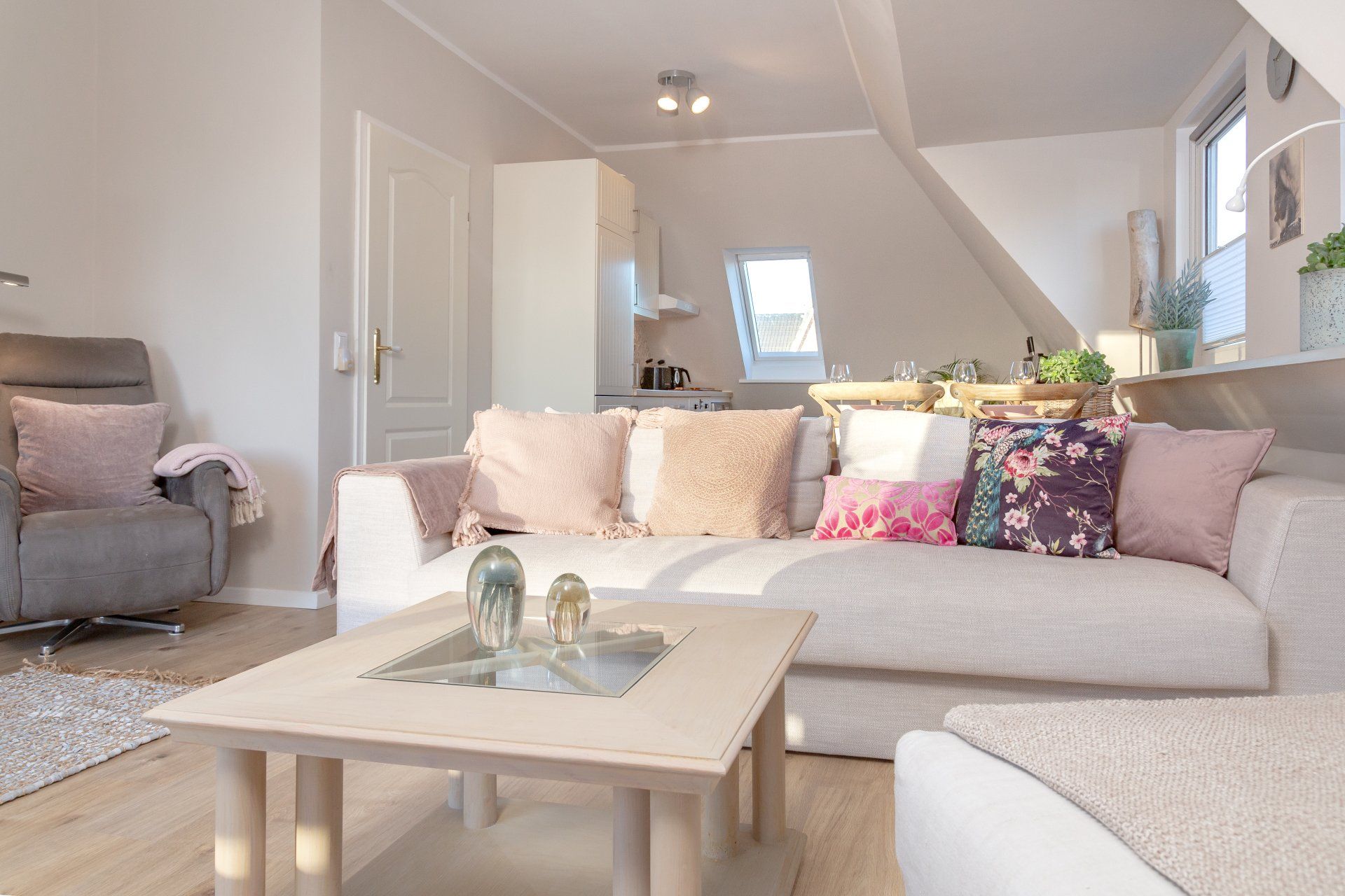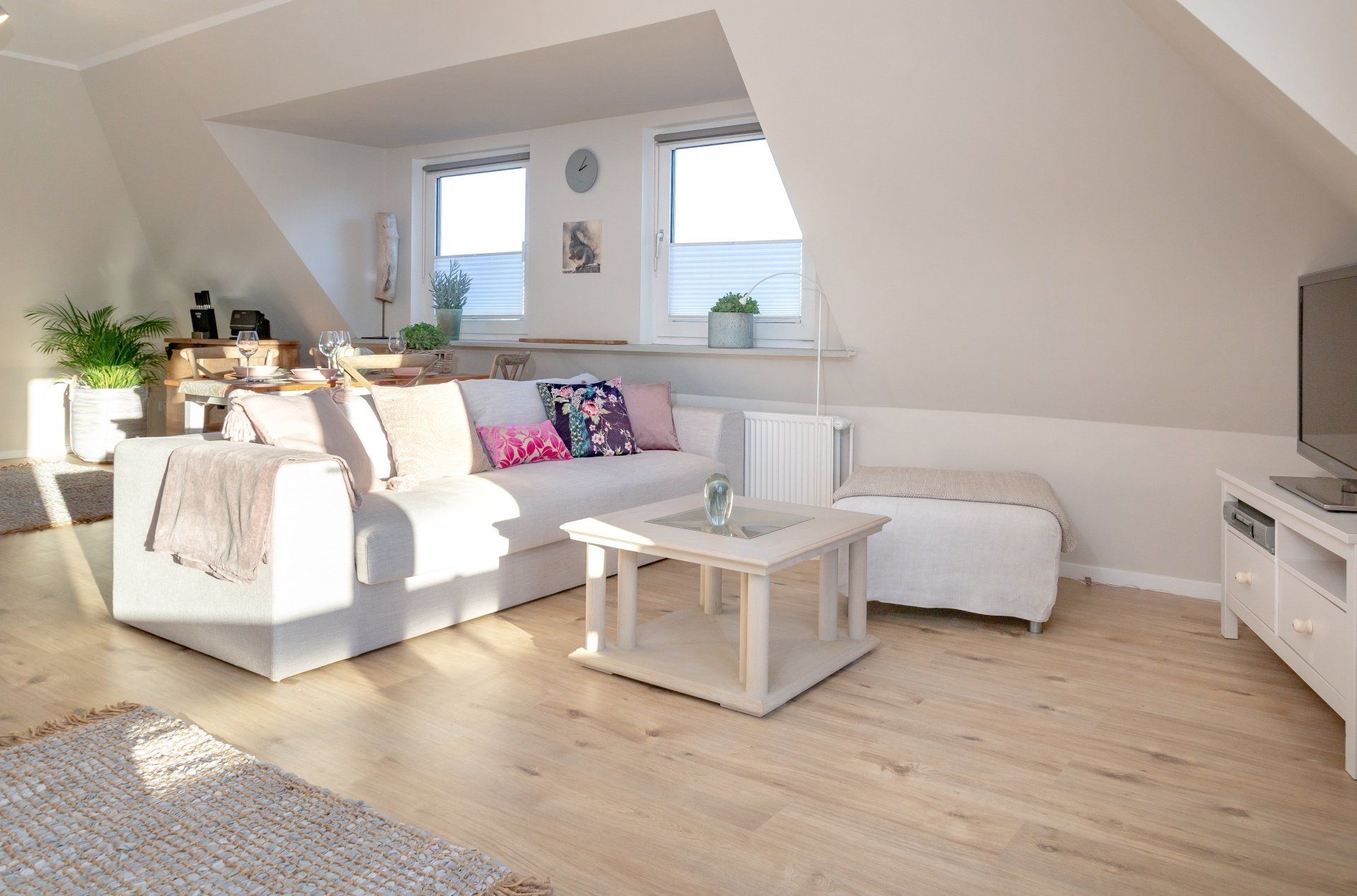 Das Möwennest ist hochwertig ausgestattet. Echtholzparkett auf den Böden und Mineralputz an Wänden und Decken verleihen der Wohnung ein gesundes Wohnklima. Ein Kachelofen sorgt in der kühleren Jahreszeit für eine kuschelige Atmosphäre.