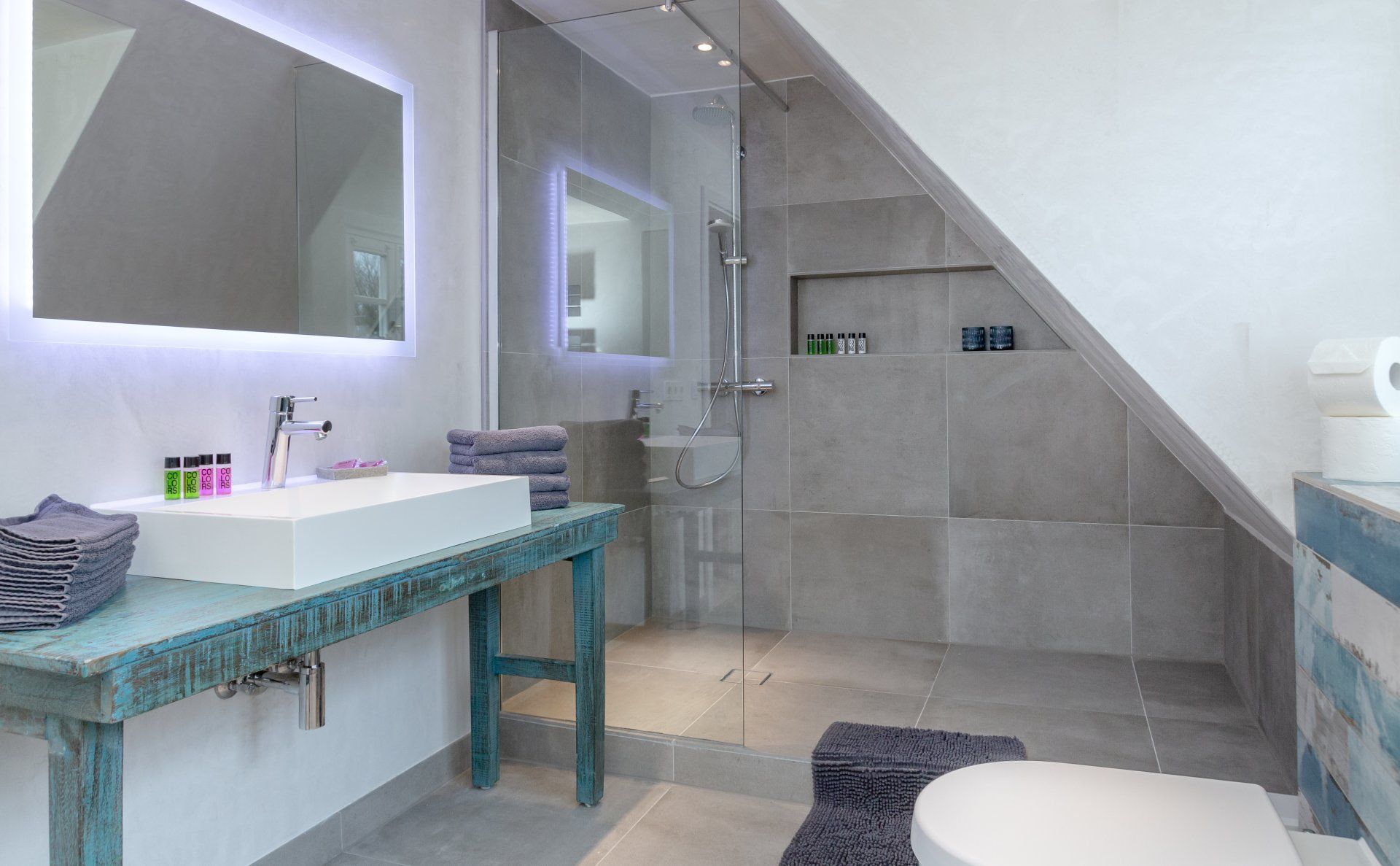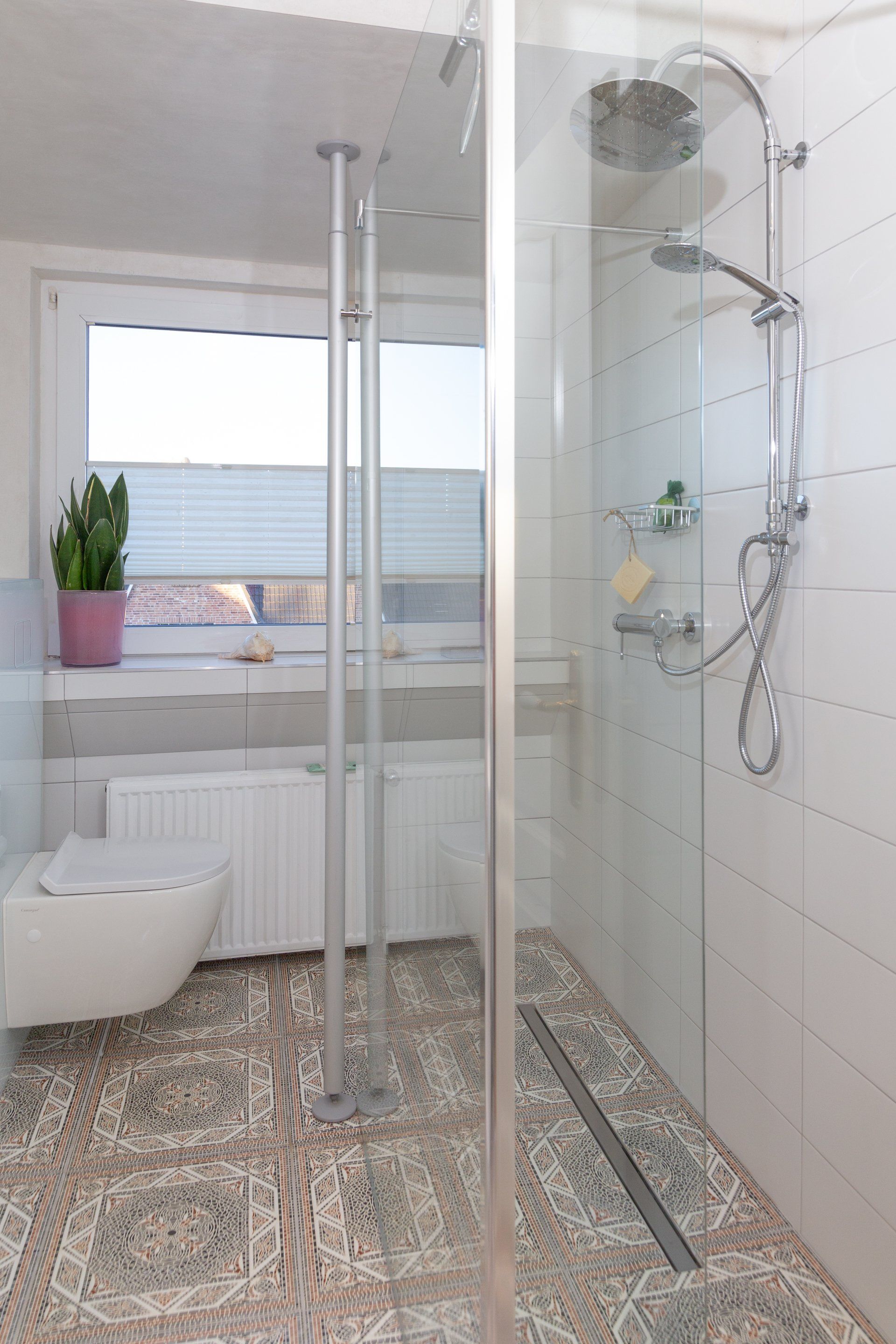Das neue Badezimmer hat eine bodengleiche Dusche.