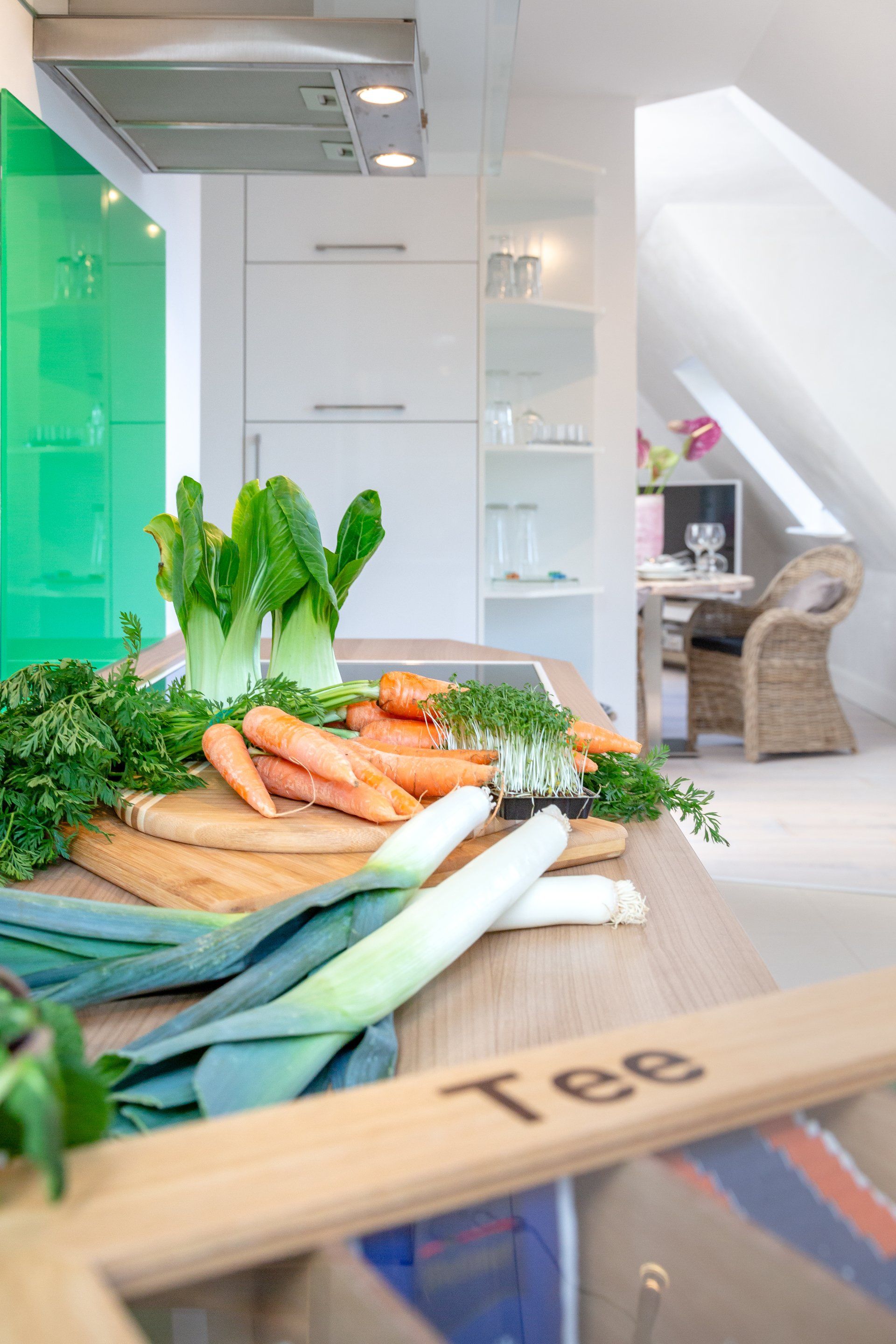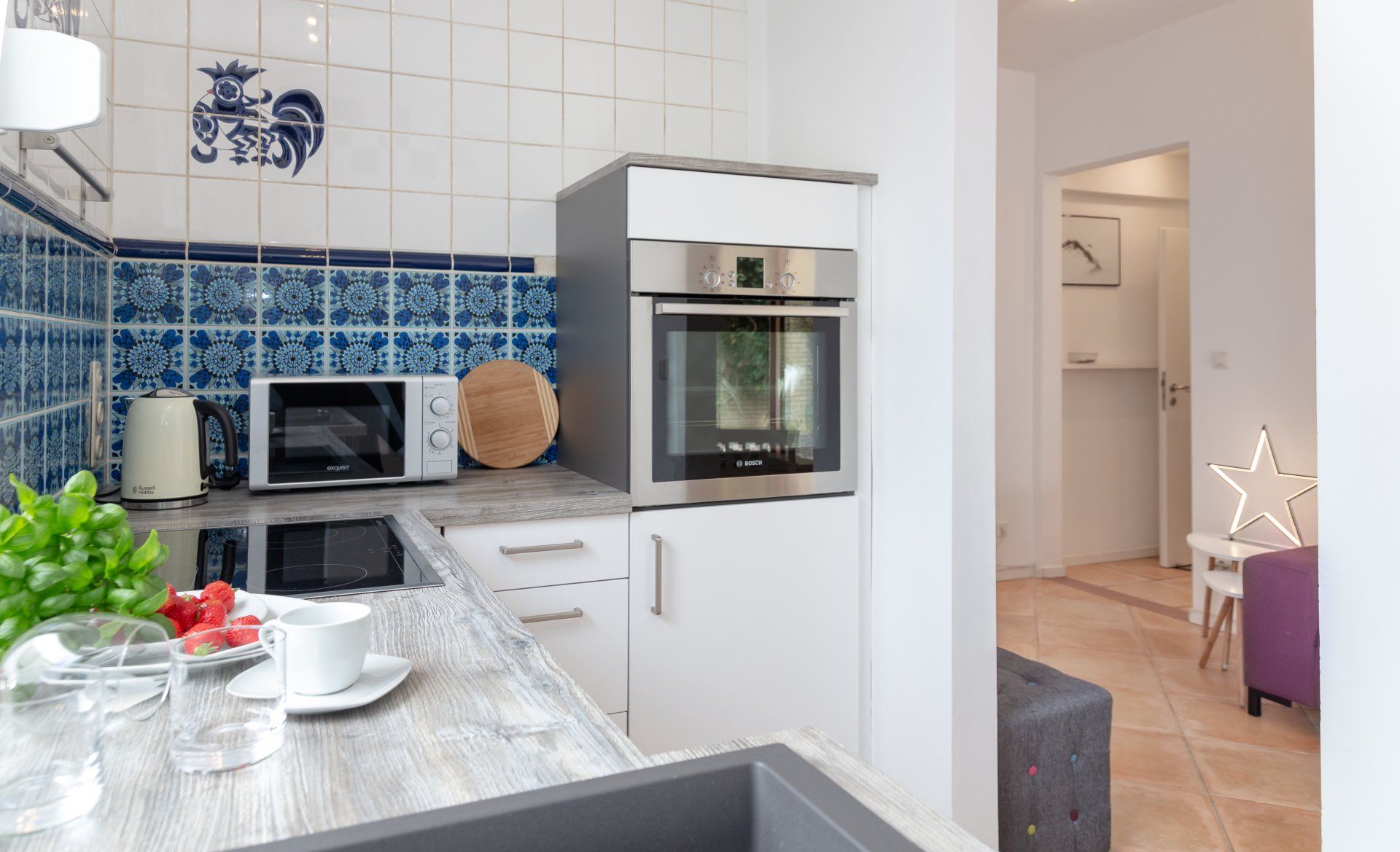 Die Küche im modernen Design ist komplett ausgestattet und verfügt über eine Geschirr-spülmaschine, Cerankochfeld, Mikrowelle mit Backofenfunktion und eine Dolce Gusto-Kaffeemaschine.