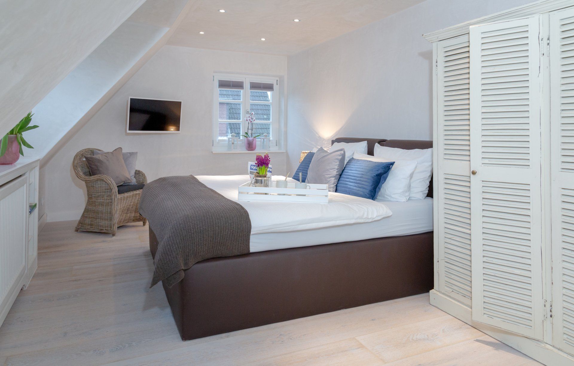 Im geräumigen Schlafzimmer mit zusätzlichen Flat-TV befindet sich ein sehr komfortables Boxspringbett 180 x 200 cm mit zwei Matratzen.