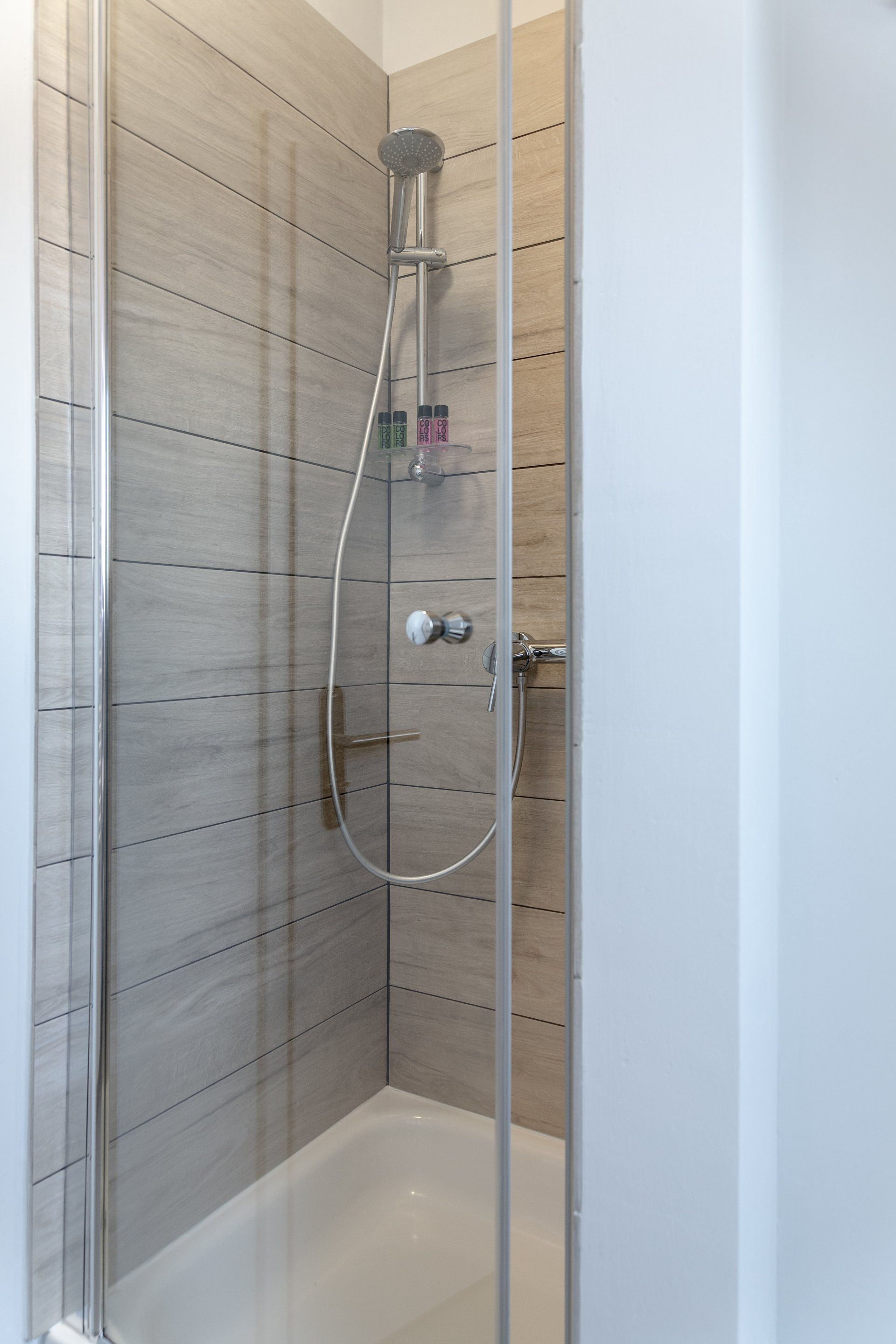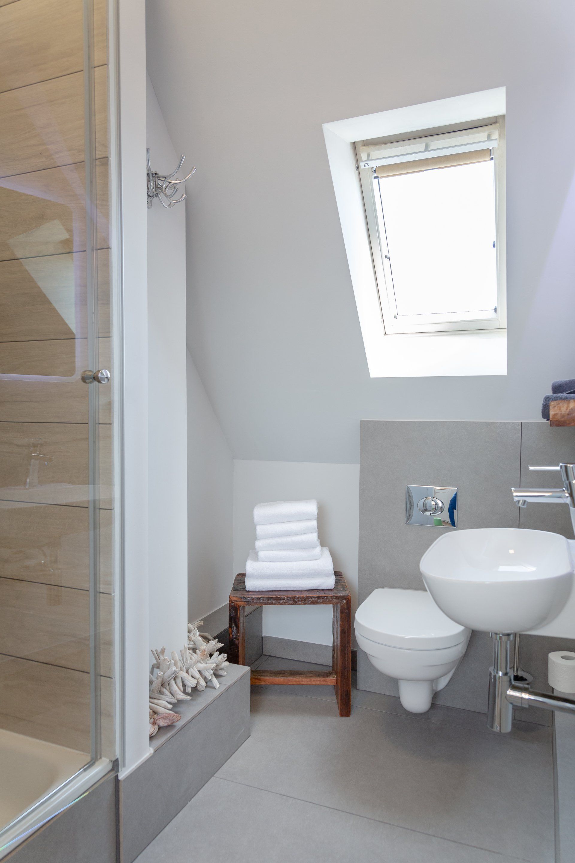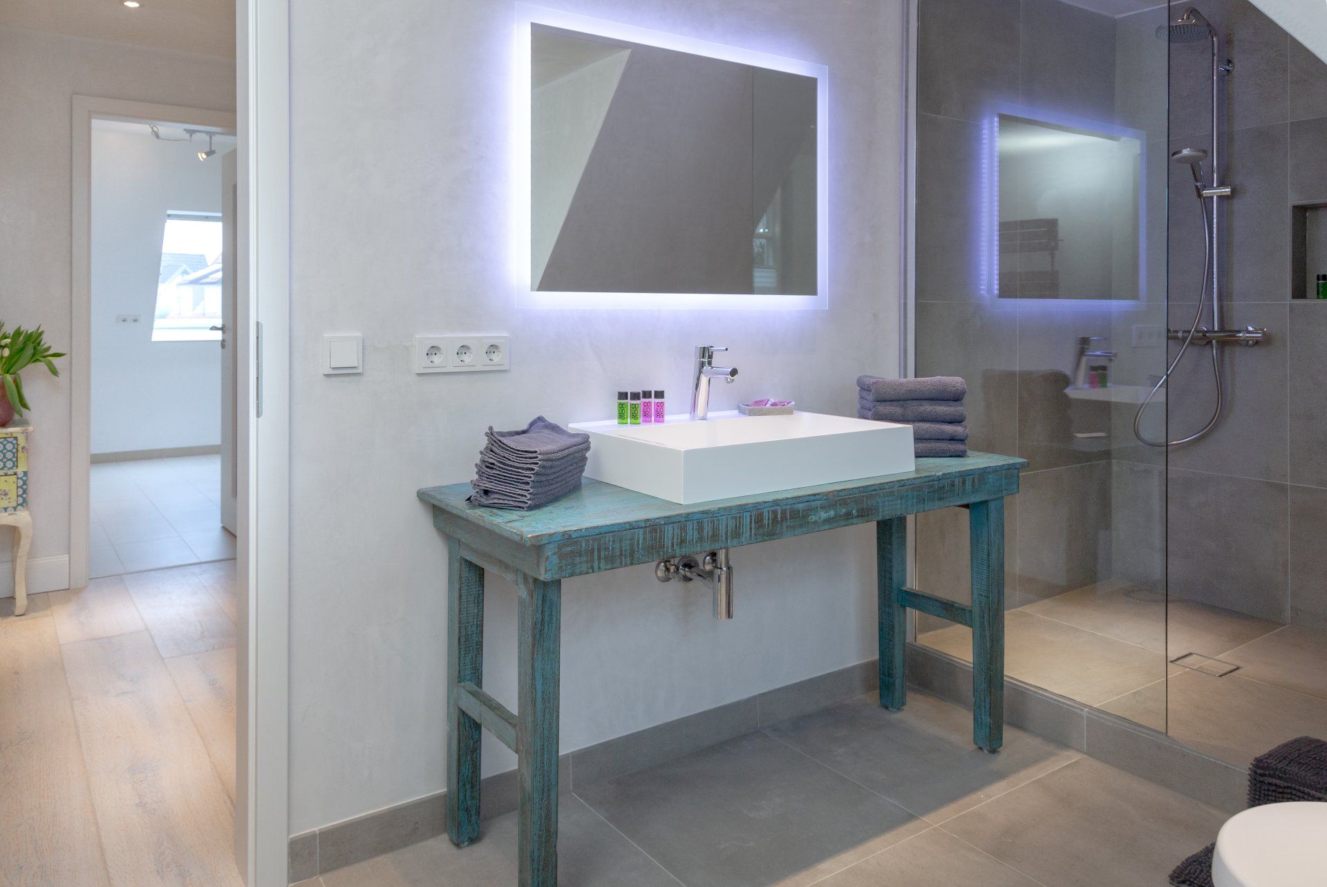 Das stylische Badezimmer verfügt über eine geräumige Regendusche Die Fußbodenheizung sorgt auch hier für wohlige Wärme.