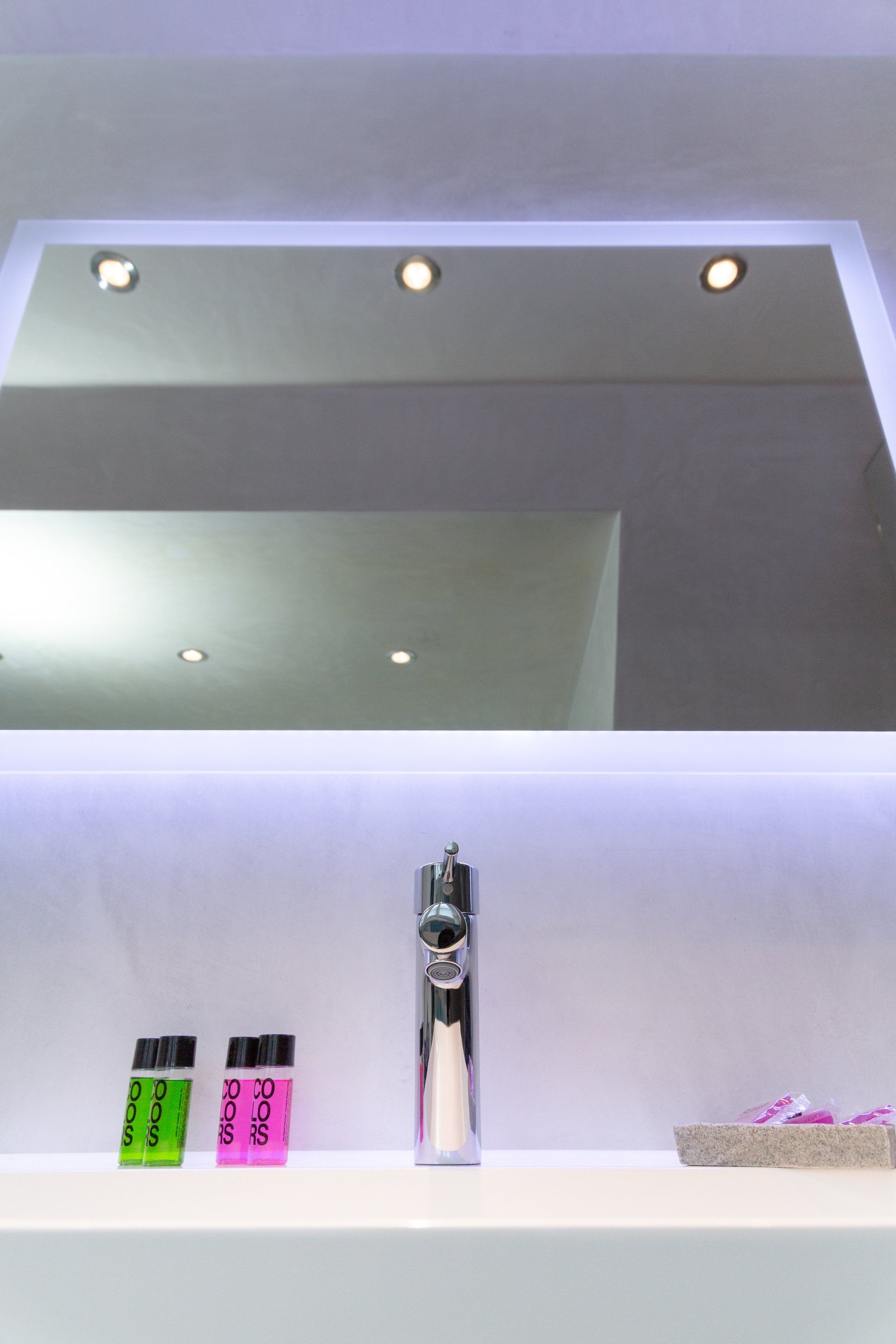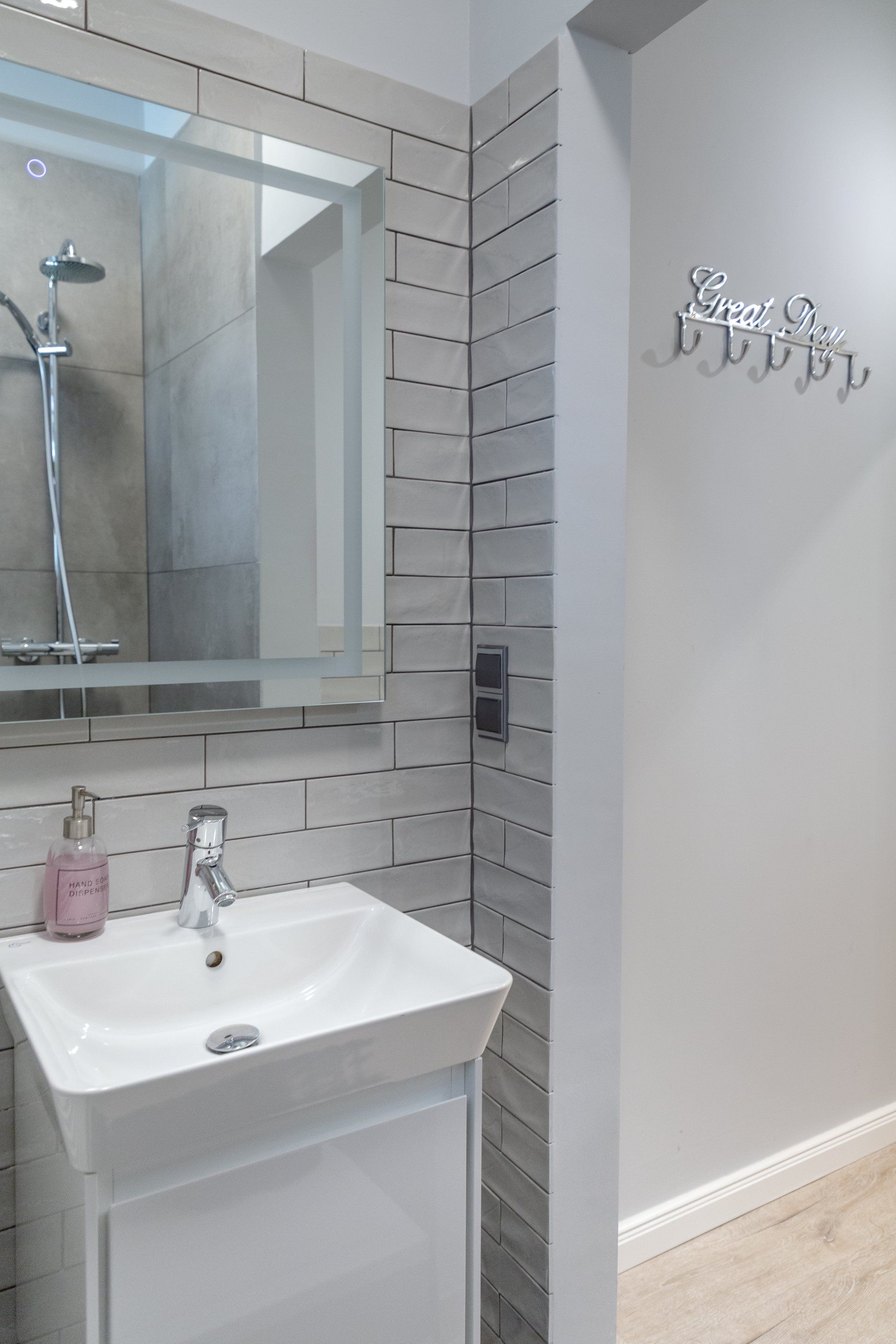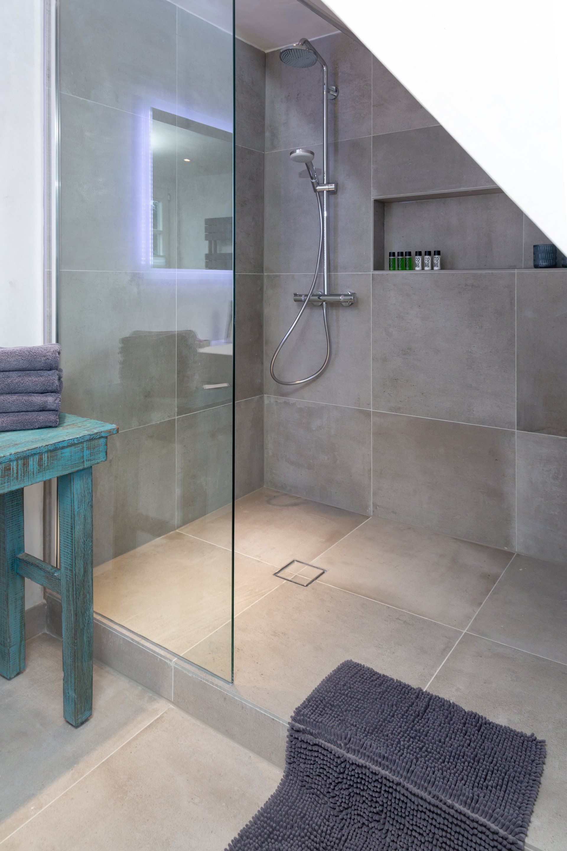 Das stylische Badezimmer verfügt über eine geräumige Regendusche Die Fußbodenheizung sorgt auch hier für wohlige Wärme.